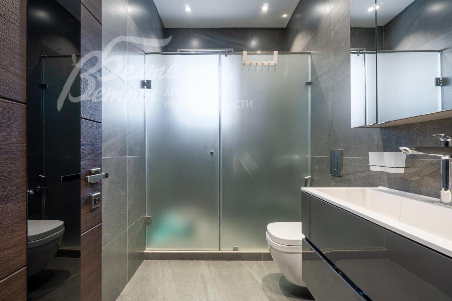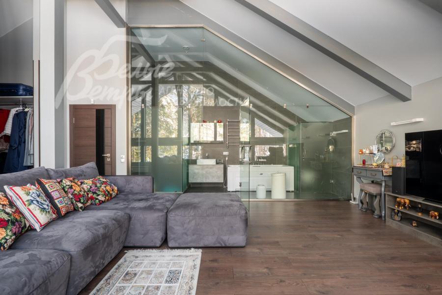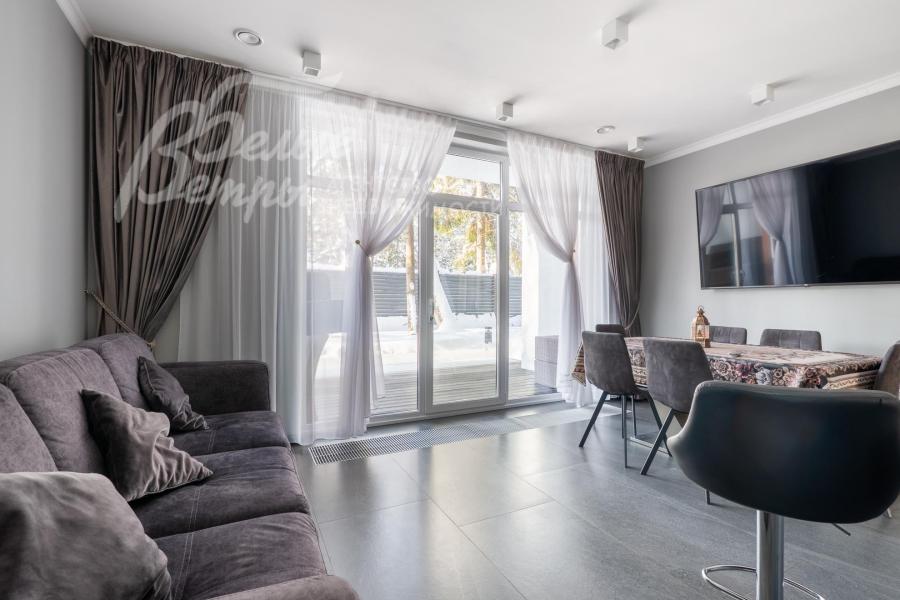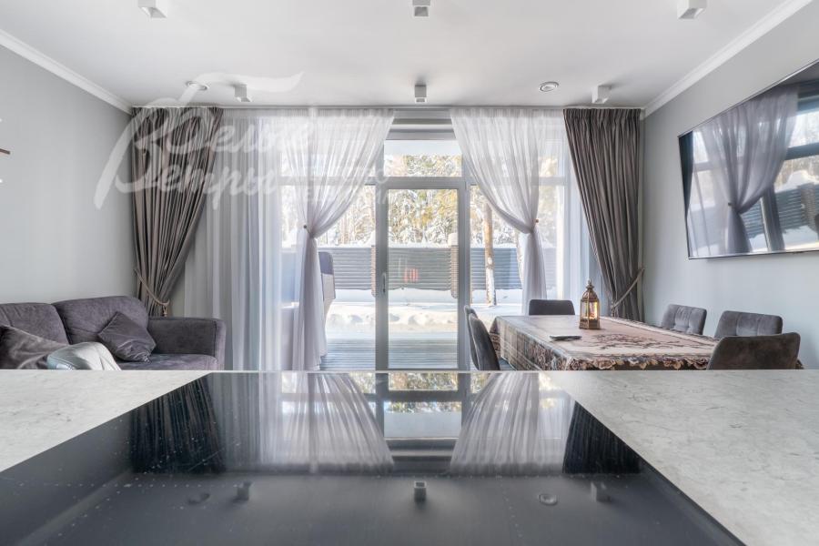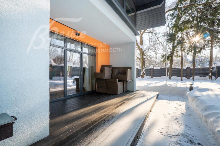 Описание внутренней отделки: в доме выполнена дизайнерская отделка в современном стиле с использованием качественных материалов, в том числе установлены энергоэффективные панорамные окна. Стены окрашены. На полу уложен итальянский крупноформатный керамогранит ATLAS CONCORDE, в спальнях – немецкий ламинат высокого класса. Потолки - гипсокартонные. Установлена электрика Legrand в лаконичном сером цвете, биметаллические радиаторы, в зоне панорамных окон предусмотрены внутрипольные радиаторы. Межкомнатные двери Verda из шпона добавляют интерьеру благородства. Лестница на второй этаж построена на металлическом каркасе, ступени отделаны лиственницей, они подсвечиваются, ограждение – стеклянное (есть зона хранения). Не террасе установлена маркиза