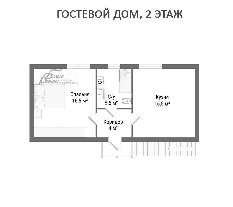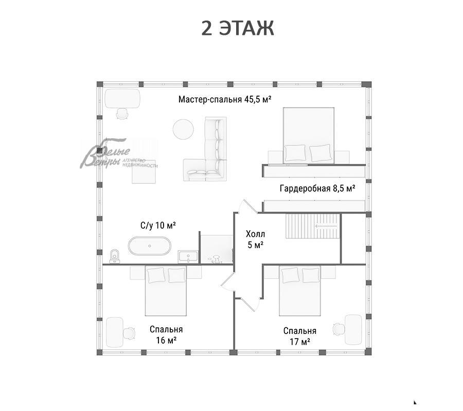 2-ой этаж: холл 5 кв.м, мастер-спальня 45,5 кв.м с санузлом 10 кв.м и гардеробной 8,5 кв.м, спальня 17 кв.м, спальня 16 кв.м