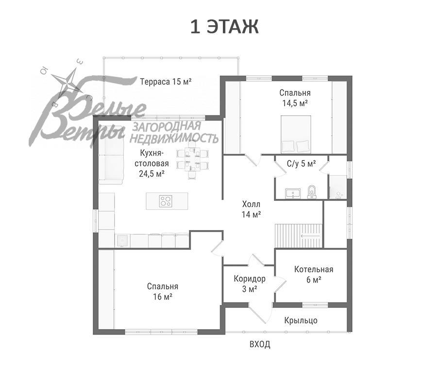 1-ый этаж: крыльцо, коридор 3 кв.м, холл 14 кв.м, кухня-столовая 24,5 кв.м, спальня 16 кв.м, спальня 14,5 кв.м, санузел 5 кв.м, котельная 6 кв.м, терраса 15 кв.м