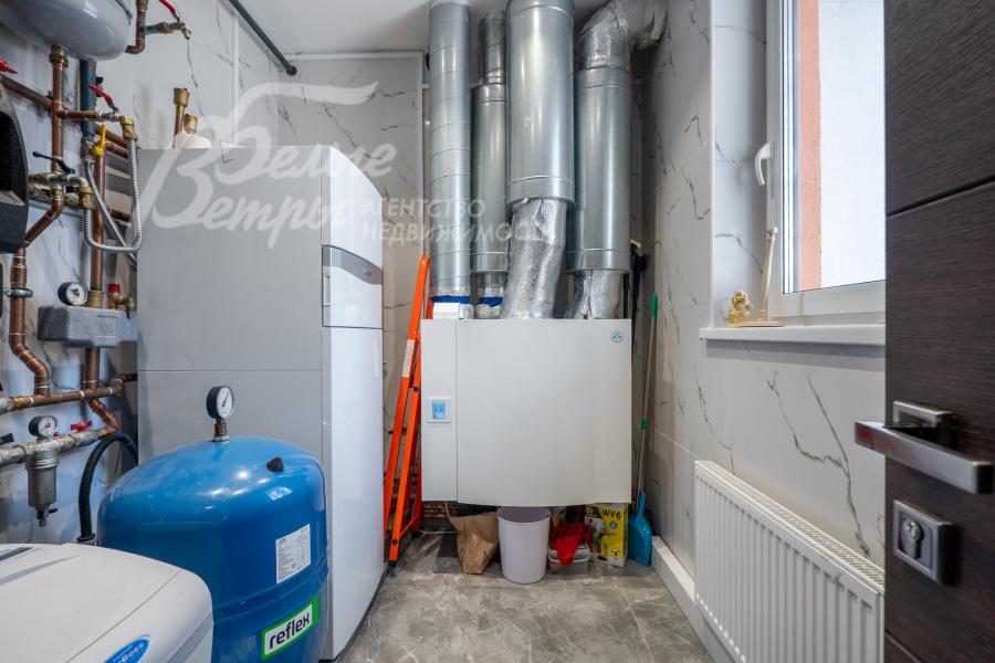 Инженерное обеспечение: в доме полностью разведены все коммуникации. Отопление – от газового котла Vaillant мощностью 26 кВт со встроенным бойлером объёмом 150 литров. Для очистки воды установлена комплексная система Whaterboss производства США. Система вентиляции представлена приточно-вытяжной установкой с рекуперацией и фильтрацией от шведского производителя Systemair. Оцинкованные вентканалы и антиаллергенные фильтры обеспечивают чистый и свежий воздух в помещениях. Есть кнопка вызова вооружённой охраны: время реагирования составляет всего 3 минуты. Дополнительные технические решения включают медную обвязку котельной и стабилизаторы напряжения